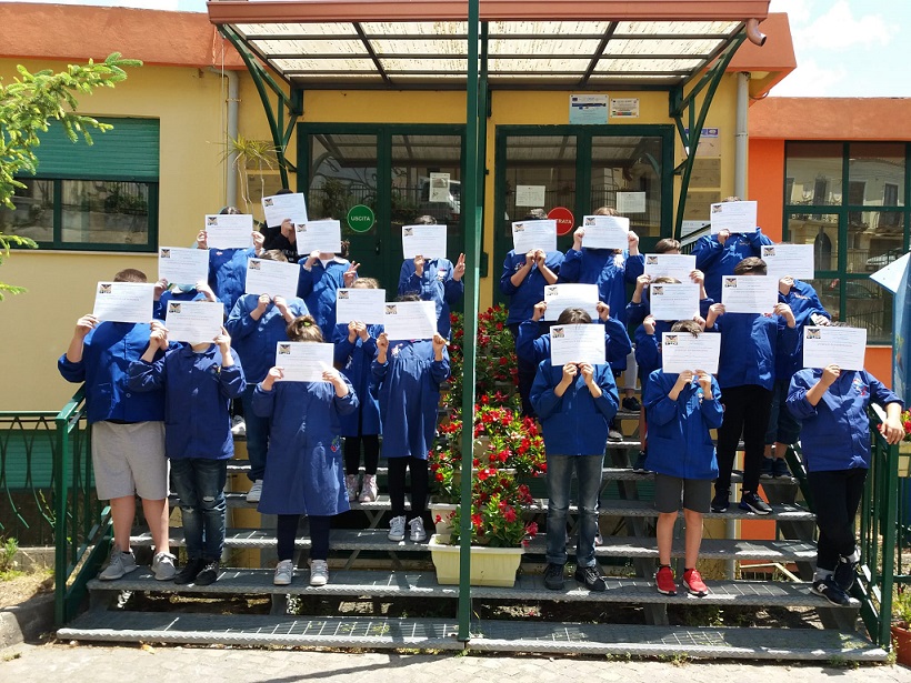 Le classi che hanno partecipato alla Marcia 2021, mostrano gli Attestati come il Santo Scolaro .... .