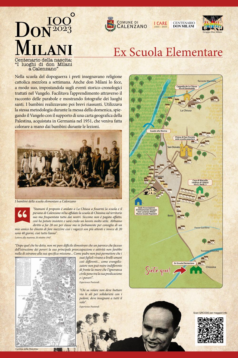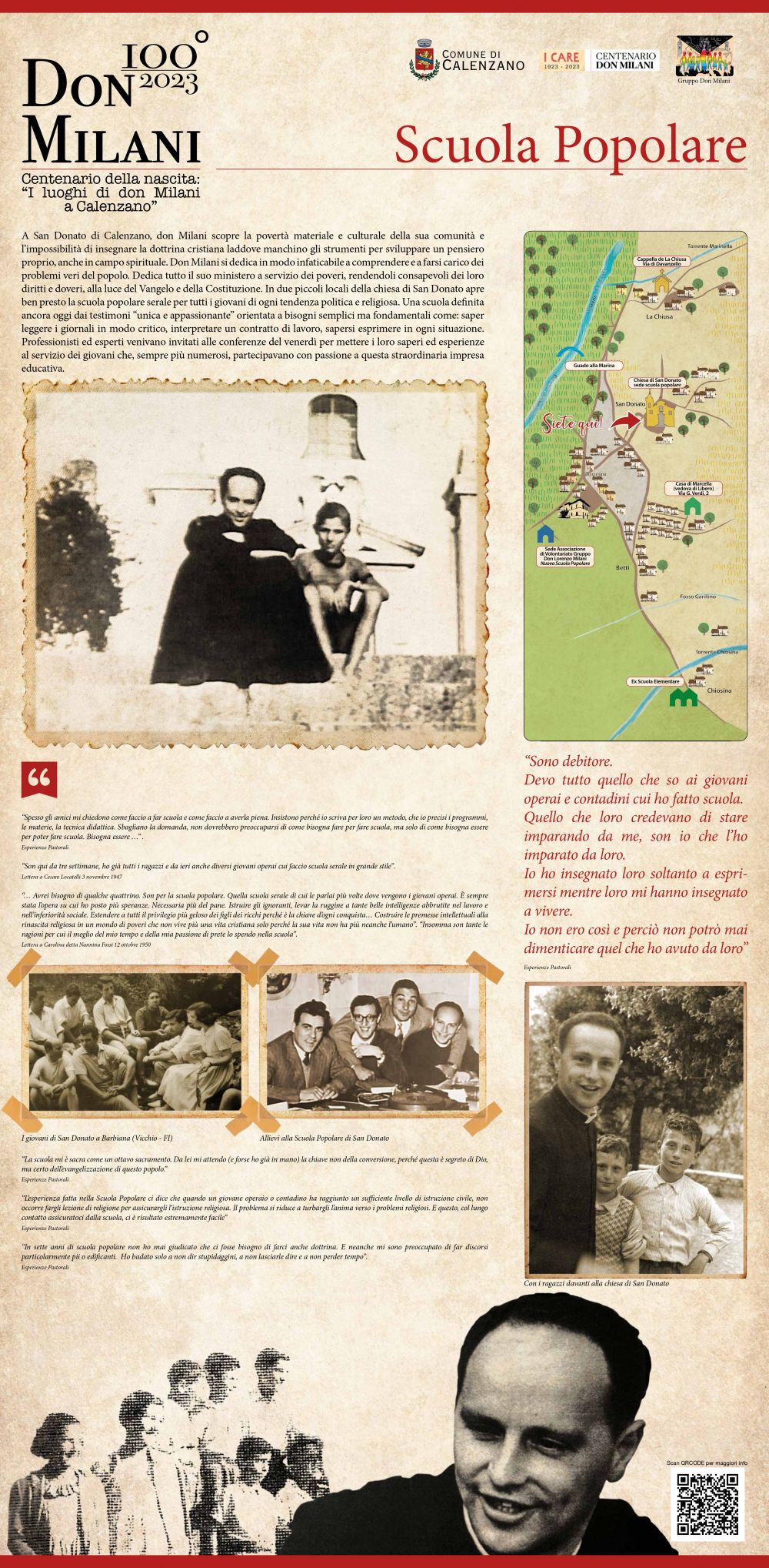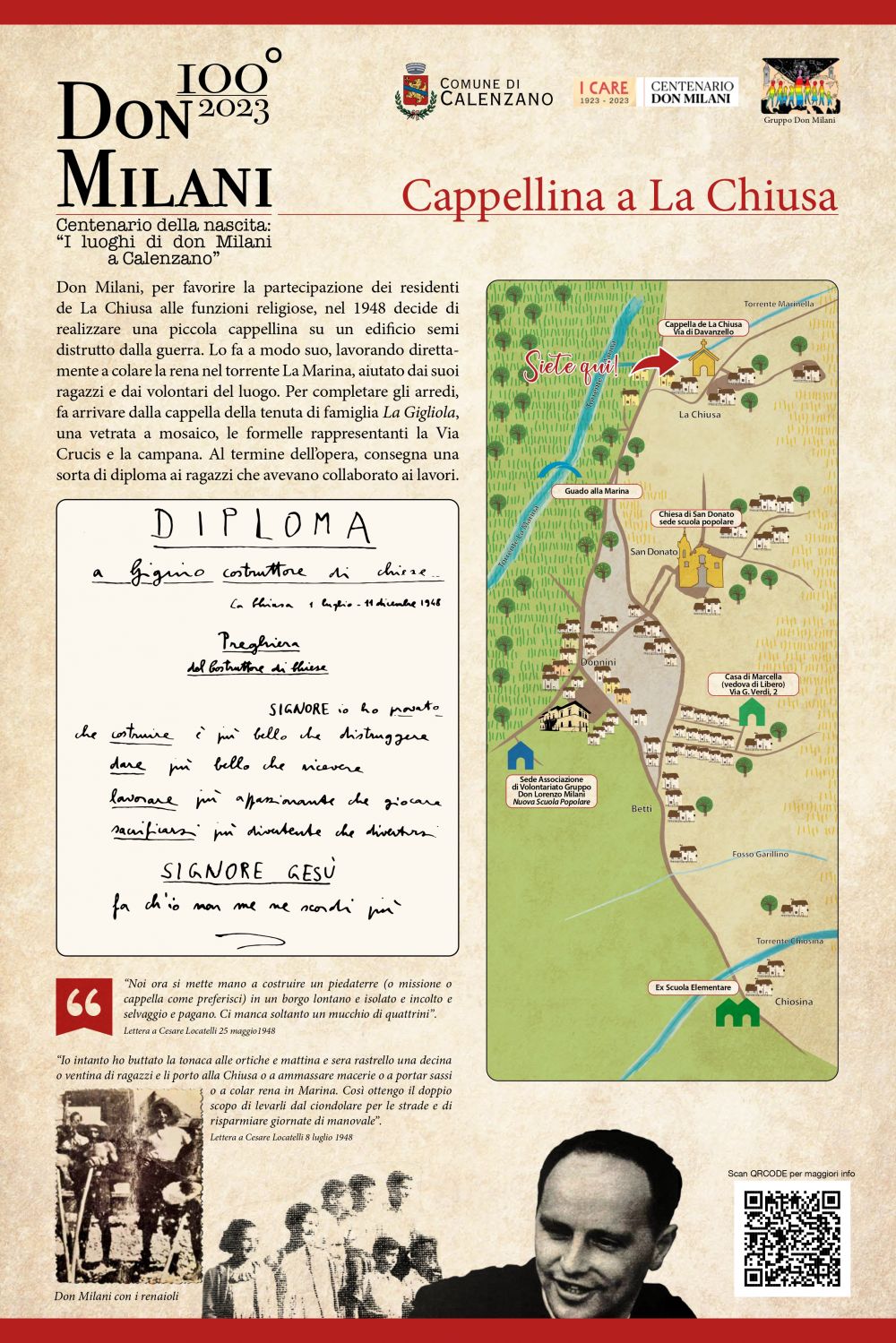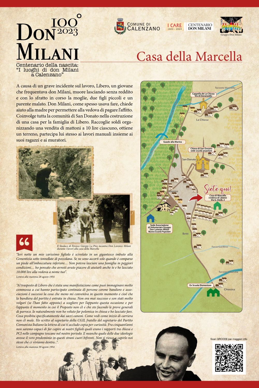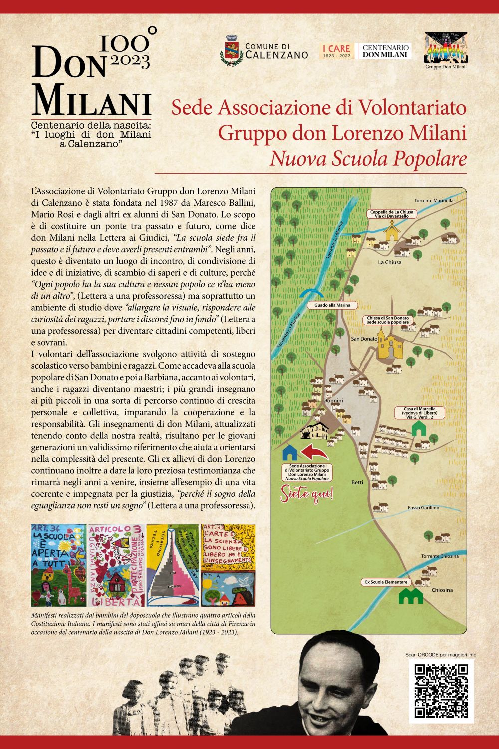 In occasione dei 100 anni dalla nascita di Don Lorenzo Milani (27 maggio 2023), il Comune di Calenzano ha organizzato una serie di iniziative per celebrare Don Milani e la sua opera a Calenzano. In collaborazione e su proposta dell’Associazione di volontariato Gruppo don Lorenzo Milani, è nato il progetto dei Luoghi di don Lorenzo Milani, proprio per riportare a Calenzano le radici di un impegno civile e religioso che ha contraddistinto la vita di Don Milani.